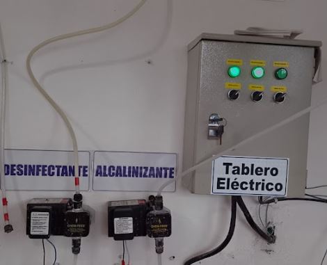 Esta mezcla homogenizada se inyecta al sistema empleando este pequeño pero moderno sistema de control eléctrico, compuesto por dos bombas dosificadoras, una para el coagulante y otra para el desinfectante. Ellas tienen control y protección a través de contactores de voltaje y temporizadores de funcionamiento.